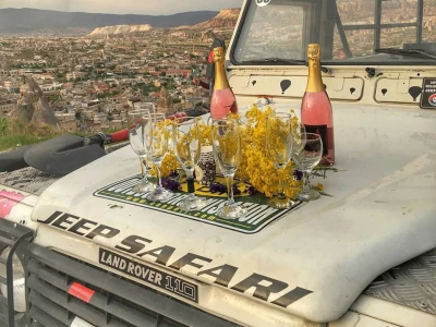 Tijdens de Cappadocië Jeep Safari tour, worden er pauzes genomen bij 5 verschillende Panoramische Locaties voor het maken van foto's. Aan het einde van de tour wordt er champagne geserveerd door de Jeep Safari chauffeurs voor de deelnemers.